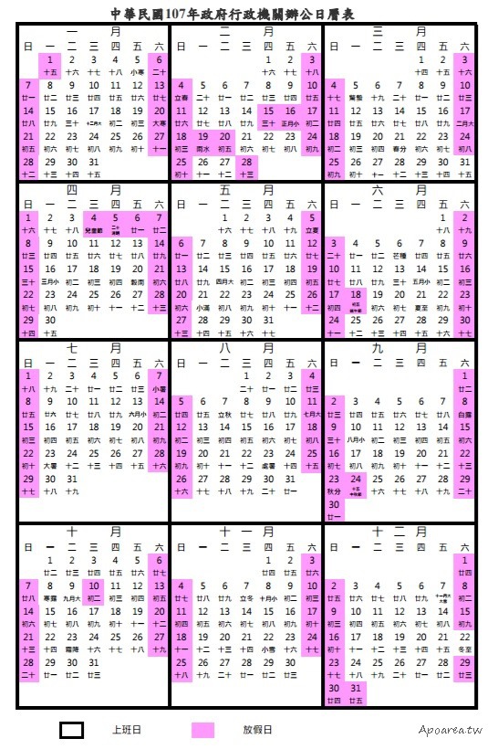 參考來源►中華民國一百零七年政府行政機關辦公日曆表